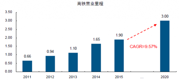 根據《中長期鐵路網規劃》,十三五期間高鐵運營里程復合增速為9.57%