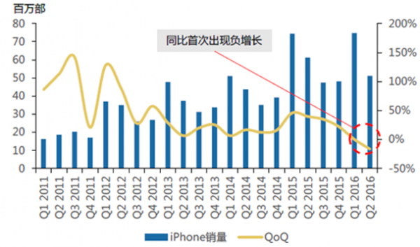 2015年國內(nèi)手機(jī)市場銷量4.38億部左右,同比增長僅3%,智能手機(jī)市場宣告進(jìn)入存量時代。在存量時代下,當(dāng)消費(fèi)者的基本使用需求已被滿足,性能、審美和差異化三個維度成為手機(jī)廠商的角力場。全球智能手機(jī)龍頭蘋果同樣陷入增長停滯,蘋果不久之前2016財年第二財季業(yè)績,其營收與凈利潤均比去年同期下滑。