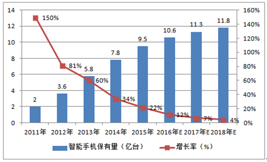2015年中國智能手機(jī)保有量為9.5億臺,同比增長22%,據(jù)預(yù)測,2018年中國智能手機(jī)保有量將達(dá)到11.8億臺,同比增長4%。