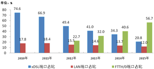 2010-2015年互聯網寬帶接入端口按技術類型占比情況