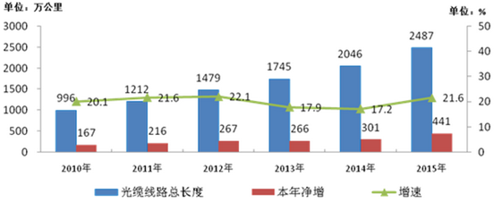 2015年,全國新建光纜線路441.3萬公里,光纜線路總長度達到2487.3萬公里,同比增長21.6%,比上年同期提高4.4個百分點。