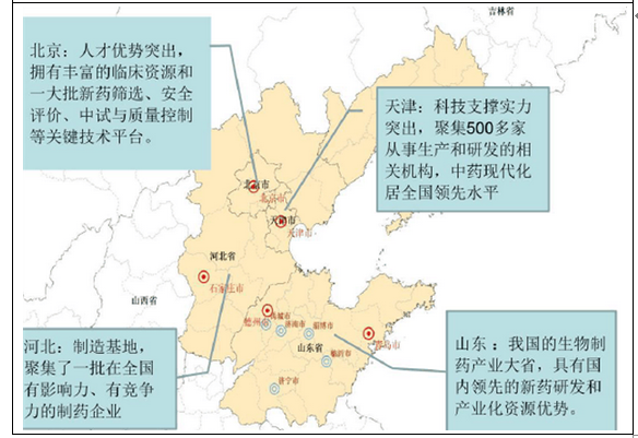 環渤海地區生物醫藥人力資源儲備最強,擁有豐富的臨床資源和教育資源。各省市在醫藥產業鏈方面具有較強的互補性,圍繞北京形成了創新能力較強的產業集群。