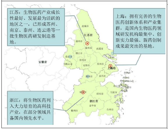 上海市跨國生物醫藥企業研發中心密集,融資環境良好,集聚了世界生物醫藥前十強中大部分企業,已經形成了以中科院藥物所、國家基因組南方中心為主的“一所六中心”體系,是長三角地區乃至我國生物醫藥的技術研發與成果轉化中心。江蘇省是我國生物醫藥制造業領域的領軍者。