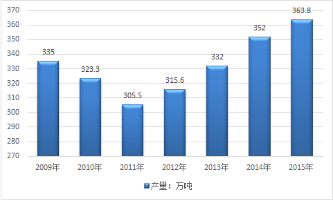 2014年我國中藥材產量達到352萬噸,產量較上年同期增長6.0%;消費量為349.7萬噸,消費規模同比增長8.7%。2015年我國中藥材產量約為363.8萬噸,產量較上年同期增長3.35%;消費量為350.6萬噸,消費規模同比增長2.3%。