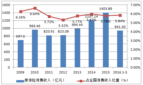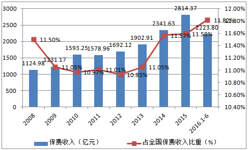 2008-2016年廣東省保費收入及占全國比重變化情況