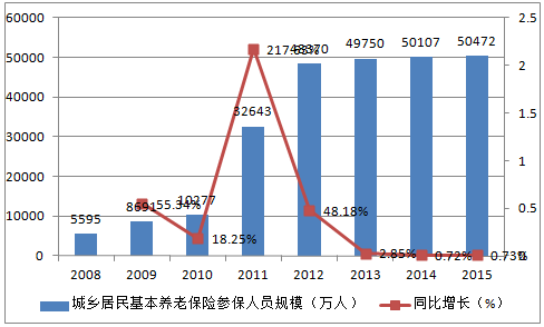 2008-2015年城鄉居民基本養老保險參保人員規模及變化