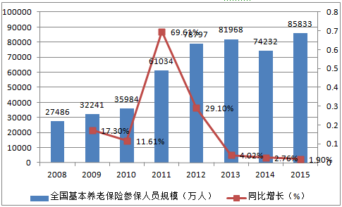 核心提示:2015年,全國參加基本養老保險人數為85833萬人,比上年末增加1601萬人,同比增長1.90%,占全國總人口比重的62.44%。2008-2015年全國基本養老保險參保人員規模及變化 2015年,城鄉居民基本養老保險參保人數50472015年,全國參加基本養老保險人數為85833萬人,比上年末增加1601萬人,同比增長1.90%,占全國總人口比重的62.44%。