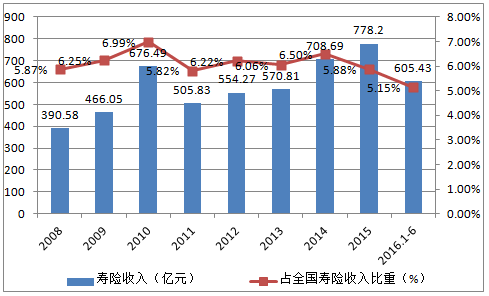 2008-2016年北京市壽險收入及占全國比重變化情況