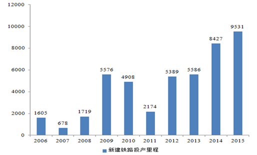 回顧近 10 年的鐵路建設(shè)的發(fā)展,可以看到鐵路新增營業(yè)里程從“十一五”期間 以來大體保持增長的態(tài)勢。“十一五”期間,鐵路新增總里程從 1605 公里增長到 4908 公里,CAGR 為 25.05%。在“十二五”期間,動(dòng)車事故導(dǎo)致 2011 年我國鐵路 建設(shè)有所放緩,當(dāng)年新增鐵路 2174 公里,但在“十二五”末,這一數(shù)值達(dá)到 9531 公里,CAGR 更是高達(dá) 34.35%。與營業(yè)里程同步增加的是鐵路固定資產(chǎn)投資額。“十一五”期間,鐵路固定資產(chǎn)總 投資從 1543 億元增長到 7075 億元,CAGR 達(dá)到 35.6%;“十二五”期間,鐵路固 定資產(chǎn)投資額的 CAGR 為 12.36%,從 4601 億元增長到 8238 億元。