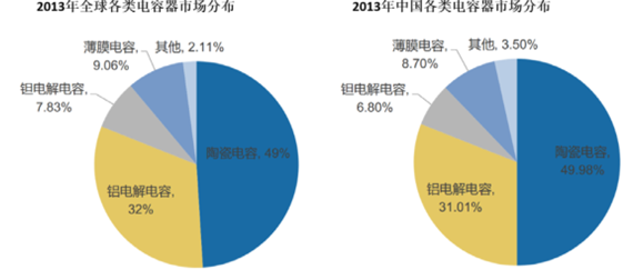 在電容器行業(yè)中,陶瓷電容器、鋁電容器、鉭電容器和薄膜電容器等四大類電容器占據(jù)了 95%以上的市場(chǎng)份額,2013 年主要電容器市場(chǎng)占比如下: