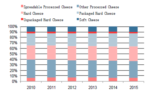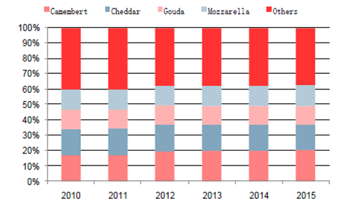 根據(jù)日本農(nóng)林省的統(tǒng)計(jì)報(bào)告,日本國(guó)產(chǎn)天然奶酪主要種類有高達(dá)(Gouda)、切達(dá)(Cheddar)(高達(dá)和切達(dá)奶酪主要用于再制奶酪的加工)、卡門貝爾(Camembert)、莫茲瑞拉(Mozzarella)、馬斯卡彭(Mascarpone)等;而夸克(Quark)的產(chǎn)量自2004年后迅速降低。其中卡門培爾奶酪(Camembert)是日本國(guó)內(nèi)最流行的天然奶酪品種(一種白色霉菌成熟軟質(zhì)奶酪)。2015 年,在日本天然奶酪產(chǎn)品中,卡門占比最大,達(dá)到20.4%,其次是切達(dá)、莫茲瑞拉和高達(dá),分別占比16.79%、13.63 和12.1%。