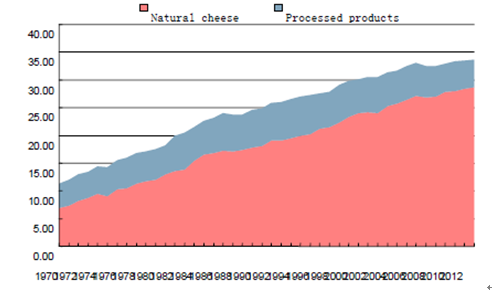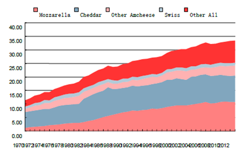 從消費種類上看,主要用于披薩制作的莫茲瑞拉(Mozzarella、天然奶酪),在2002年取代車達(Cheddar、再制奶酪主要來源品種)成為美國消費量最多的品種,人均消費量達到9.6磅,是1970年的8倍,而同期車達奶酪的人均消費量僅增長62%達到9.4磅/人。