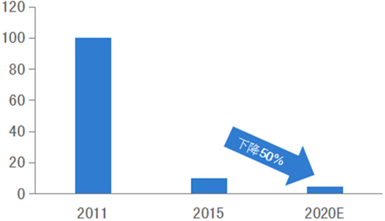 2015年石墨烯粉體價格相對2011了下降幅度超過90%,據(jù)預測,未來五年石墨烯粉體價格仍將繼續(xù)下降,2020年石墨烯粉體價格將下降至5萬元/噸,對應的鋰電池領(lǐng)域石墨烯市場規(guī)模將超過11億元。