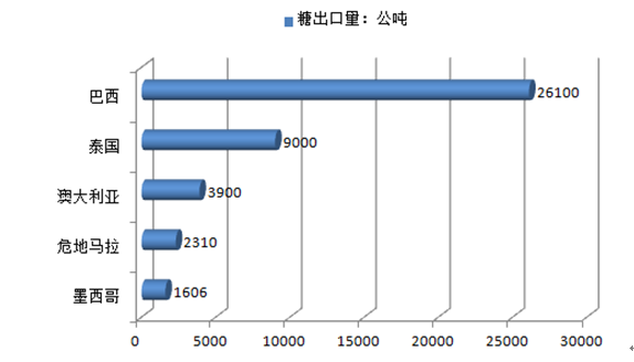 2016年度全球糖出口量前五位的國家分別是巴西、泰國、澳大利亞、危地馬拉、墨西哥。