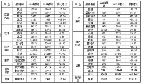 三、 輕卡細分企業銷量同比 江淮與長城增 福田、江鈴、東風降