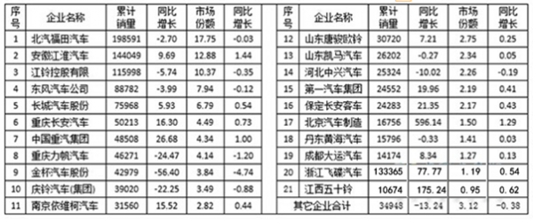 行業前10排名同比,行業前3甲——福田、江淮與江鈴繼續保持上年同期的行業第1、第2與第3位;東風、長城、重慶長安、中國重汽等分別由上年同期的第5、第6、第9與第10升至第4~第7;重慶力帆、金杯與慶鈴則由上年同期的第4、第7與第8后退至第8~第10位。