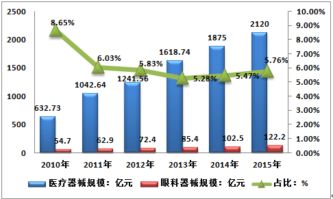 2010-2015年中國眼科器械、中國醫(yī)療器械行業(yè)市場規(guī)模及占比情況