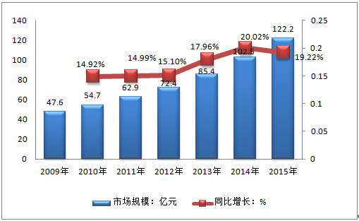 核心提示:智研咨詢發(fā)布的《2016-2022年中國眼科器械市場競爭格局及投資前景評估報告》顯示,2015年全球眼科醫(yī)療器械市場已達286億美元。我國眼科醫(yī)療行業(yè)是名副其實的朝陽行業(yè)。2015年我國眼科醫(yī)療器械市場規(guī)模約122.2億元,同比2014年的中經(jīng)先略數(shù)據(jù)中心發(fā)布的《2016-2022年中國眼科器械市場競爭格局及投資前景評估報告》顯示,2015年全球眼科醫(yī)療器械市場已達286億美元。我國眼科醫(yī)療行業(yè)是名副其實的朝陽行業(yè)。2015年我國眼科醫(yī)療器械市場規(guī)模約122.2億元,同比2014年的102.5億元增長了19.22%,近幾年我國眼科醫(yī)療器械行業(yè)市場規(guī)模情況如下圖所示: