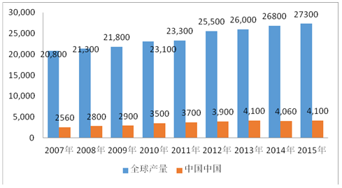 中經先略數據中心發布的《2016-2022年中國銀礦石產業市場競爭現狀及市場前景預測研究報告》顯示,2007年我國銀礦產量為2560公噸,2007年全球銀礦產量為20800公噸。2015年我國銀礦產量為4100公噸,全球產量為27300公噸。