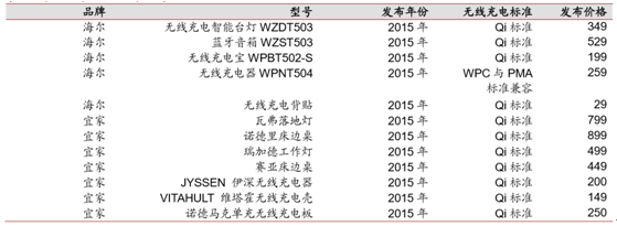 家用電器產品大幅增長,而不直接使用交流電,采用電池供電的產品大量增加,功率較 小的電池供應的產品未來使用前景較為廣闊,對于充電提出了新的要求。家電等廠商推 出無線充電的產品,來實踐無線充電技術。以海爾為例,積極推出無線充電的產品,包 括臺燈,藍牙音箱,充電器等產品,甚至電飯煲、攪拌機等傳統家電類產品,宜家也有 家居類產品推出。