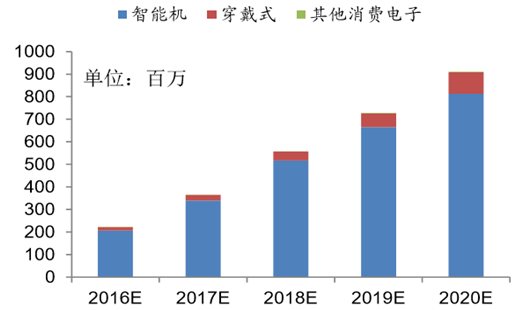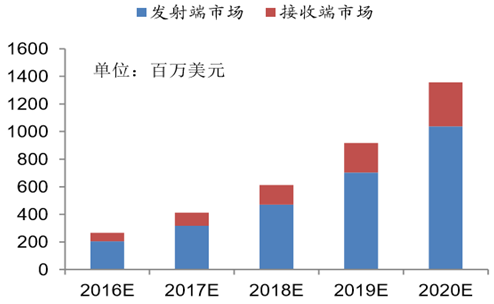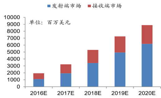 預計 2016 年搭載無線充電的穿戴設備在 1540 萬部左右,其中 Apple Watch 出貨量 1000 萬左右,占比最高。預計 2020 年接近 1 億部出貨量,年均增速達到 58%。由于穿戴式設備無線充電發射端與接收端 比例接近 100%,發射端同樣保持較快成長的態勢。2016 年整體解決方案市場 2.67 億 美元,到 2020 年實現 13.56 億美元。