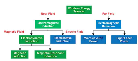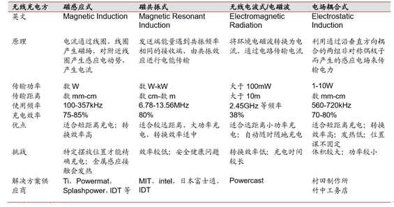 從具體技術原理及解決方案來說,可分為電磁感應以及電磁波兩種方式,其中電磁感應 適合近距離傳輸,包括電動感應與電場耦合兩種方式,電動感應中磁感應與磁共振是最 常見的無線充電方式;遠距離傳輸主要通過電磁波傳輸實現,包括微波/射頻、光/激光 等方式。原理有所不同,傳輸功率、使用方式、使用距離等有也有明顯不同。