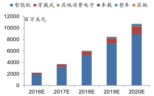 在手機創新支持以及 2017 年 iPhone 帶動下,預計無線充電在手機中滲透率快速成長。 2016 年搭載無線充電的手機有望超過 2.06 億部,智能機中滲透率超過 14%;預計到 2020 年滲透率達到 55%,超過 8.12 億部。15-20 年年均增速達到 52%。對應接收端 8.32 億美元成長到 27.04 億美元,發射端則從 11.0 億美元成長到 61.8 億美元。