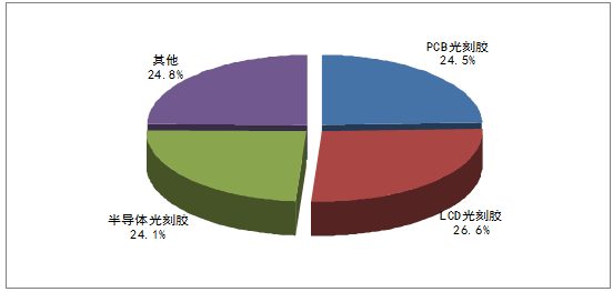 中經先略數據中心發布的《2017-2022年中國光刻膠市場運行態勢及投資戰略研究報告》顯示,而就下游細分需求領域而言,2015年全球PCB領域光刻膠需求規模為18.0億美元,占行業需求總量的24.5%;LCD光刻膠需求市場規模為19.6億美元,占行業需求總量的26.6%;半導體光刻膠需求規模為17.7億美元,占比為24.1%。