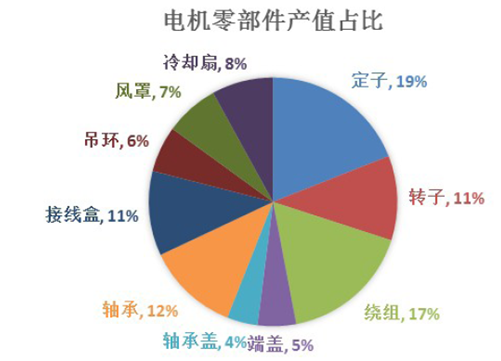 從電機產(chǎn)值構(gòu)成看,雖然電機規(guī)格和種類較多,但結(jié)構(gòu)大致相同,主要包括:定子部分:機座、定子鐵芯、定子繞組;轉(zhuǎn)子部分:轉(zhuǎn)子鐵芯、轉(zhuǎn)子繞組;其他部分:端蓋、軸承蓋、軸承、接線盒、吊環(huán)、風(fēng)罩和冷卻扇等。定轉(zhuǎn)子作為核心部件,其產(chǎn)值在電機零部件的總產(chǎn)值中占比近30%。綜合以上兩方面,硅及矽鋼沖壓行業(yè)在電機生產(chǎn)鏈條中居于重要地位。