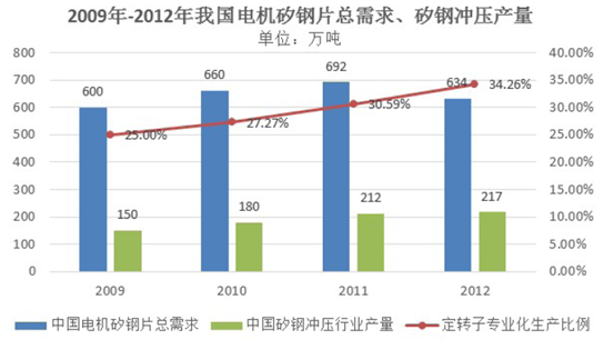 隨著國內(nèi)電機制造行業(yè)專業(yè)化程度不斷提升,國內(nèi)電機制造企業(yè)外購定轉(zhuǎn)子沖片和鐵芯的比例也將不斷提高。2009 年全國電機硅/矽鋼片總需求量約為600 萬噸,其中由專業(yè)定轉(zhuǎn)子鐵芯生產(chǎn)企業(yè)提供的數(shù)量為150 萬噸,占總量的25%;2012 年電機行業(yè)硅/矽鋼總消耗量為634 萬噸,其中由專業(yè)定轉(zhuǎn)子鐵芯生產(chǎn)企業(yè)提供的數(shù)量為217 萬噸,占總量的34.26%。