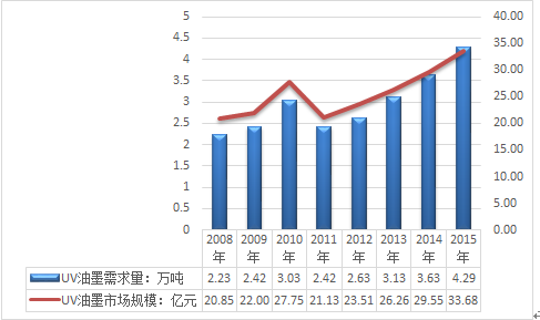 2008-2015年我國UV油墨需求總量及規(guī)模走勢圖