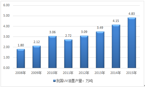 我國UV 油墨的市場雖然起步較晚,但近年來隨著國內(nèi)經(jīng)濟的持續(xù)增長而呈現(xiàn)快速增長的局面。據(jù)不完全統(tǒng)計,2012-2015年我國UV 油墨產(chǎn)量依次達到3.09萬噸、3.49萬噸、4.15萬噸、4.83萬噸。