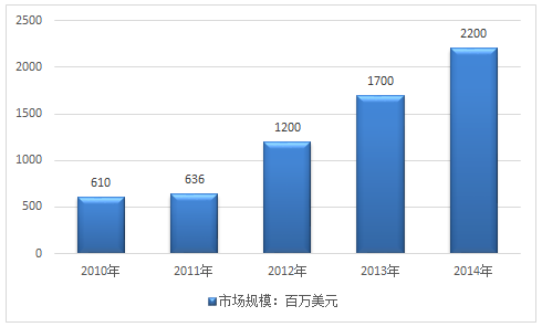 2010-2014年全球個人/家用服務機器人市場規模走勢圖