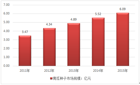 中經先略數據中心發布的《2016-2022年中國蔬菜種子行業進出口態勢分析及對外貿易前景展望報告(12099100)》顯示,2014年我國南瓜種子市場規模為5.52億元,2015年產品規模增長至6.09億元,較上年同期增長10.3%。