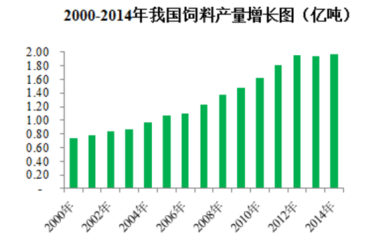 我國飼料工業起步于上世紀70年代末,80年代中期蓬勃興起,1991年飼料總產量達到3,570萬噸,成為僅次于美國的第二大飼料生產國。2014年,我國飼料總產量達到1.97億噸。飼料工業已成為我國農業中工業化程度最高的產業。