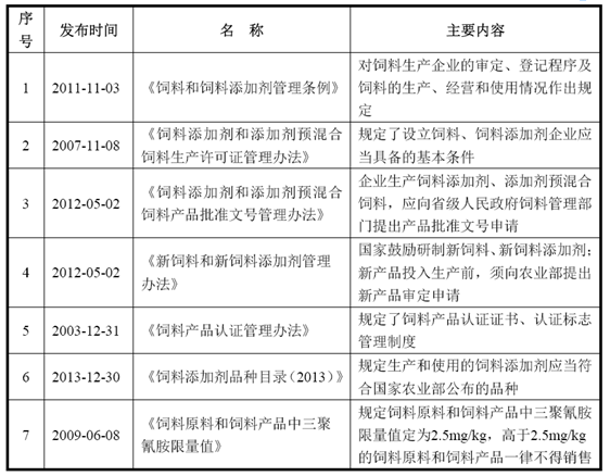 目前,規范我國飼料行業的主要法律、法規及規范性文件主要內容如下:
