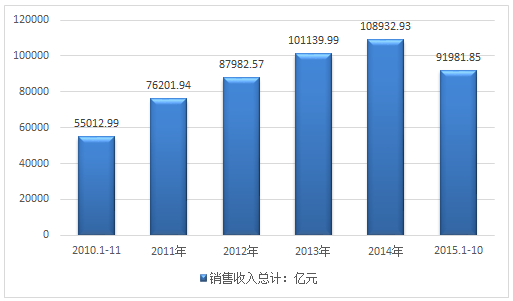 2015年1-10月我國食品行業銷售收入為108932.93億元。2015年1-10月行業利潤總額為91981.85億元。