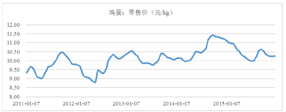 2011 年-2015 年全國雞蛋零售價格的波動趨勢如下圖: