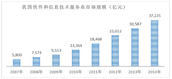 根據(jù)工信部發(fā)布的《2014 年1-12 月軟件業(yè)經(jīng)濟運行情況》,2014 年我國軟件和信息技術(shù)服務(wù)業(yè)實現(xiàn)軟件業(yè)務(wù)收入3.7 萬億元,同比增長20.2%。我國軟件和信息技術(shù)服務(wù)業(yè)收入由2007 年的5,800 億元增長至2014 年3.7 萬億元,《軟件和信息技術(shù)服務(wù)業(yè)“十二五”發(fā)展規(guī)劃》指出,到2015 年,軟件和信息技術(shù)服務(wù)業(yè)的業(yè)務(wù)收入突破4 萬億元,占信息產(chǎn)業(yè)比重達到25%,年均增長24.5%以上。