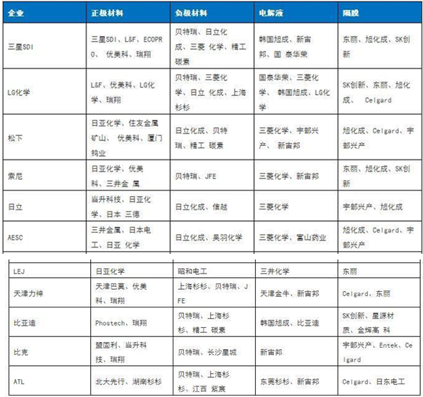 正負極材料、電解液和隔膜等材料廠商為鋰離子電池產業鏈的上游企業,為鋰離子電芯廠商提供原材料。