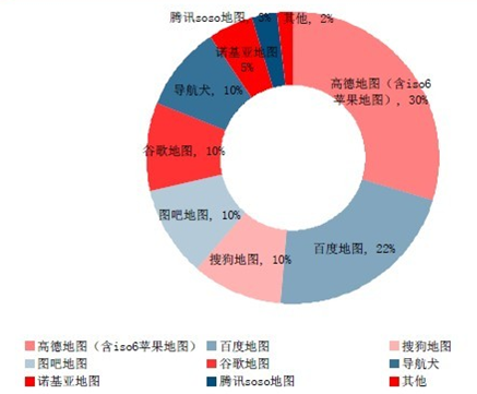 數據顯示,高德和百度分別以29.8%和21.6%的市場份額占據前兩位,兩者占據了手機地圖一半以上的市場。當前地圖平臺尚在應用接入與服務豐富階段,兩家都有很大空間,最后的勝負尚需幾年時間才能決定。中國手機地圖累計用戶數市場份額(在線式手機地圖導航客戶端/僅限智能終端)