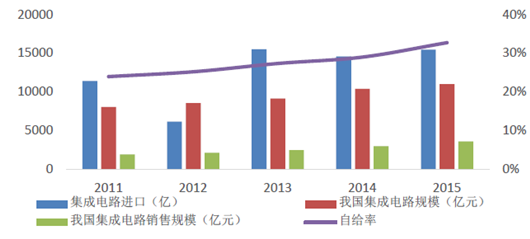 2015年我國集成電路進口額為 15000 億元,是自2013年超過原油成為我國第一大進口商品后的連續第三年。2015年我國集成電路需求總額約為1萬億元,而完全由中國廠商自己銷售的金額約為3000億元,由此推斷我國集成電路的自給率為30%左右,對外依存度要高于石油。