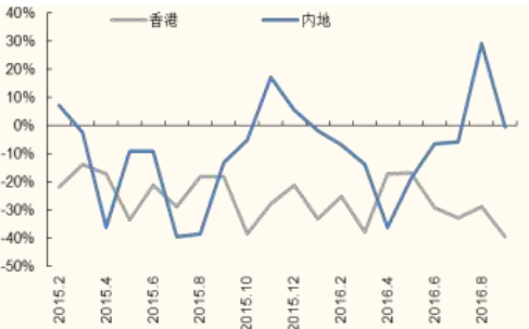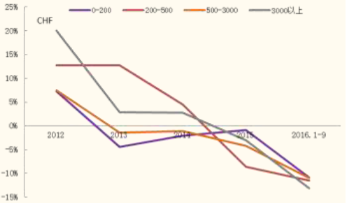 1)無論從金額還是數量,2012年以來降幅最大的是200-500瑞士法郎(合人民幣1400-3500元)和3000瑞士法郎以上(合人民幣35000元)價位段。我們判斷200-500價格區間受到智能手表沖擊最為嚴重,12-14年該價位段出口額相對穩定,15年伴隨Apple watch上市,全球智能腕表出貨量進入高峰,該價位區間瑞士表出口額增速從+4.4%驟降至-8.8%,2016年智能表出貨量有所下降,1-9月份該價位段出口額下降11.5%,增速的環比下降幅度有所縮窄,已與其他價位段手表降幅接近。3000以上的奢侈品腕表則直接受到中國反腐和全球經濟不景氣影響,今年以來降幅仍在擴大。