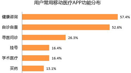 用戶對移動醫療APP功能滿意度方面,預約掛號功能的用戶滿意度最高,其次為擁有家庭醫生助手功能和通過查詢獲得電子簡歷。而用戶經常使用的移動醫療APP功能中,健康咨詢占57.4%,自診自查占52.6%,成為用戶最常使用的移動醫療APP功能。