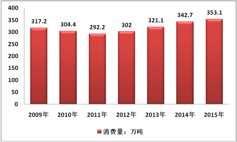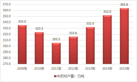據統計,2014年我國中藥材產量達到352萬噸,產量較上年同期增長6.0%;消費量為349.7萬噸,消費規模同比增長8.7%。2015年我國中藥材產量約為363.8萬噸,產量較上年同期增長3.35%;消費量為353.1萬噸,消費規模同比增長3.03%。