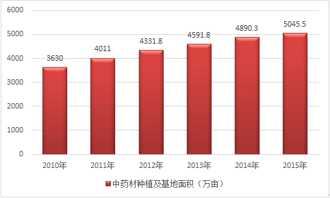 核心提示:我國中藥材種植主要分布在湖南、貴州、甘肅、陜西、遼寧、廣東等幾個省市。2015年我國中藥材種植面積約5045.5萬畝,近幾年我國中藥材種植面積情況如下圖所示:本文選自:《2017-2022年中國中藥材市場運行態勢及投資戰略研究報告》2010我國中藥材種植主要分布在湖南、貴州、甘肅、陜西、遼寧、廣東等幾個省市。2015年我國中藥材種植面積約5045.5萬畝,近幾年我國中藥材種植面積情況如下圖所示:本文選自:《2017-2022年中國中藥材市場運行態勢及投資戰略研究報告》