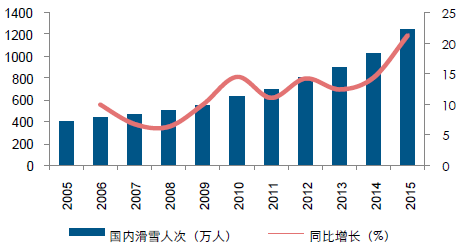 2015 年我國滑雪總人次同比增長21.4%,滑雪體育旅游前景廣闊