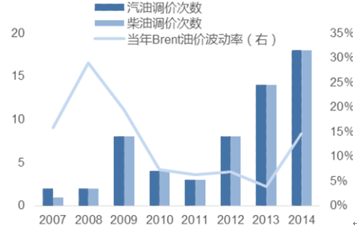 核心提示:在原油價格持續上升的階段中,按照新的定價機制,國內成品油調價較為及時,反映出油價的最新變化,而原油庫存成本則相對較低,兩者價差呈現擴大趨勢,有助于煉廠的利潤改善。2007-2014年中國柴油、汽油調價次數情況2010-2015年中國原油進口在原油價格持續上升的階段中,按照新的定價機制,國內成品油調價較為及時,反映出油價的最新變化,而原油庫存成本則相對較低,兩者價差呈現擴大趨勢,有助于煉廠的利潤改善。