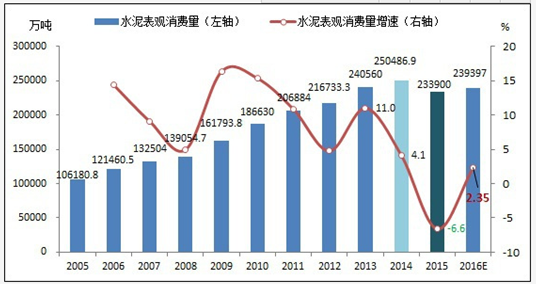 2016年全國水泥表觀消費量及增速預估