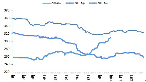 2014-2016年分年度水泥價格指數(shù)走勢